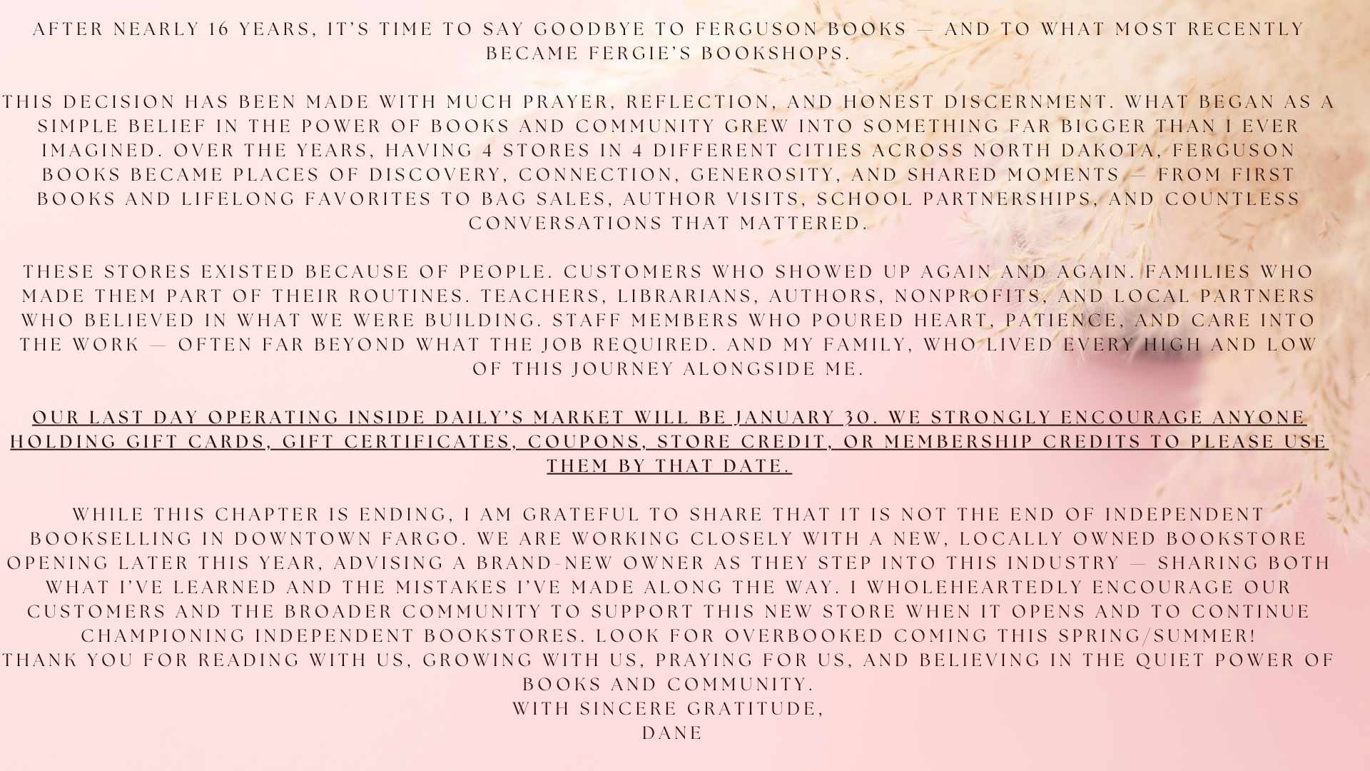 This decision has been made with much prayer, reflection, and honest discernment. What began as a simple belief in the power of books and community grew into something far bigger than I ever imagined. Over the years, having 4 stores in 4 different cities across North Dakota, Ferguson Books became places of discovery, connection, generosity, and shared moments — from first books and lifelong favorites to bag sales, author visits, school partnerships, and countless conversations that mattered.